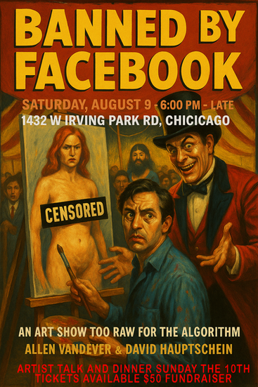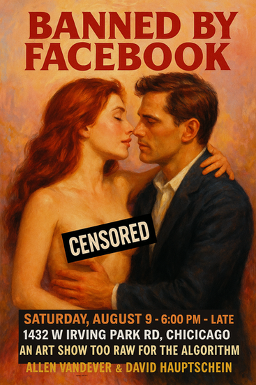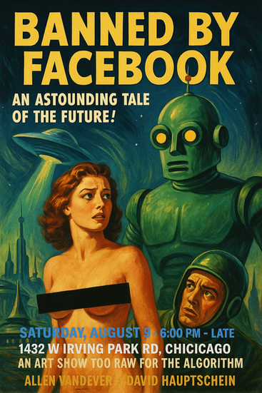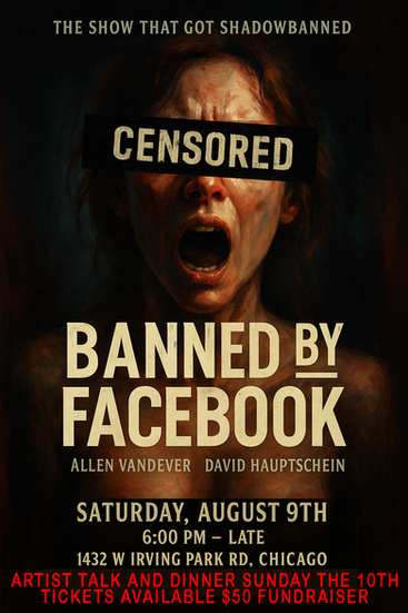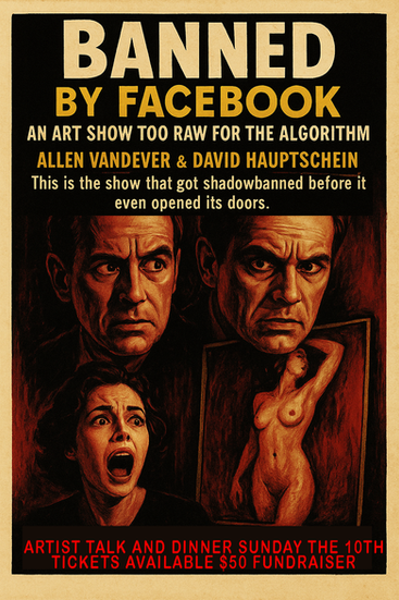 On Saturday, August 9, 2024, Phygital Art Gallery was buzzing—not with the polite hum of “content-approved” art shows, but with the raw static of work that algorithms can’t handle. Banned By Facebook, a one-night exhibition by Allen Vandever and myself, was everything the title promised: provocative, unapologetic, and too real for the feed.